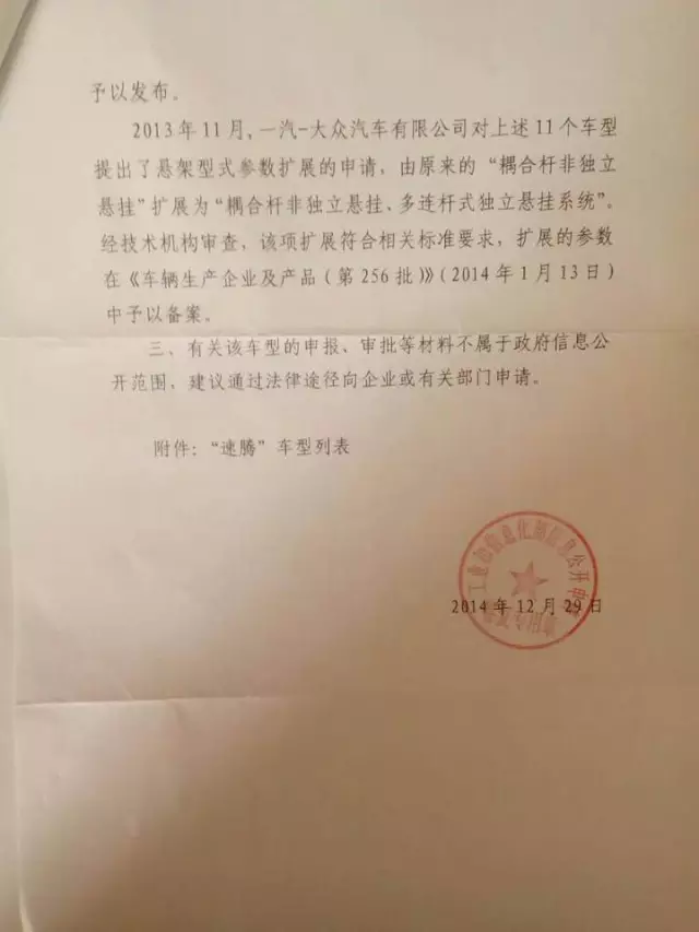 2015年4月27日,中华人民共和国工业和信息化部(以下简称“工信部”)针对百余名车主的复议申请作出了驳回申请的复议决定。工信部自受理该案至决定作出,没有出示任何当初作出审批大众速腾非独立悬架的具体行政行为所依据的证据、依据和其他材料,而空有一纸答辩状。