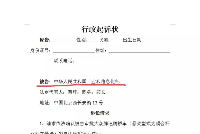 在上述这则起诉状中,感到利益受损的速腾车主们提出的核心诉求只有一项,“请求依法确认被告审批大众牌速腾轿车(悬架型式为耦合杆非独立悬挂)的具体行政行为违法”。