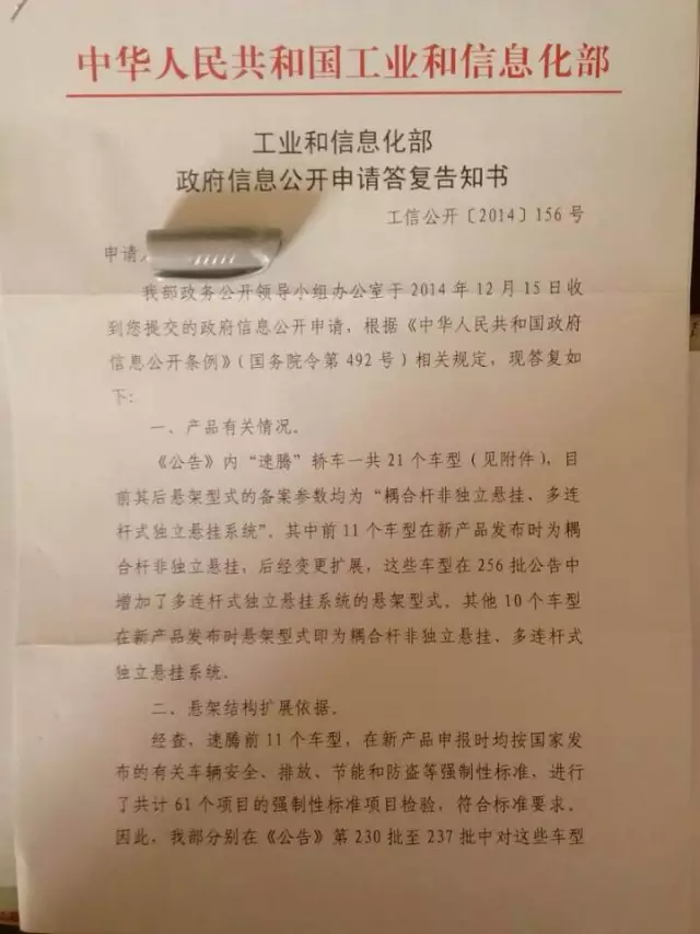 工信部于2015年4月22日以“工信复决字(2015)10号”文件↓↓回复称,车辆悬架型式备案不是行政许可行为,且产品符合相关准入许可要求,不存在违规审批。工信部据此驳回了行政复议申请。
